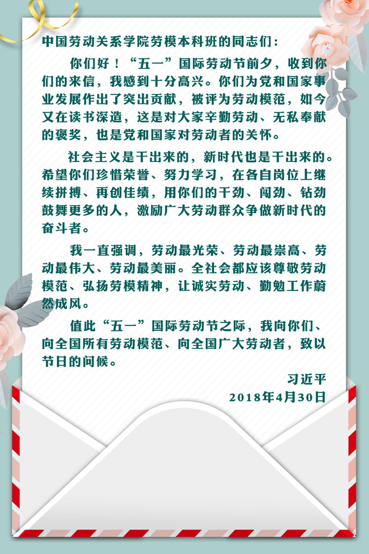 2018年4月30日,习近平给中国劳动关系学院劳模本科班学员回信。他在信中写道,社会主义是干出来的,新时代也是干出来的。希望你们珍惜荣誉、努力学习,在各自岗位上继续拼搏、再创佳绩,用你们的干劲、闯劲、钻劲鼓舞更多的人,激励广大劳动群众争做新时代的奋斗者。他同时强调,全社会都应该尊敬劳动模范、弘扬劳模精神,让诚实劳动、勤勉工作蔚然成风。