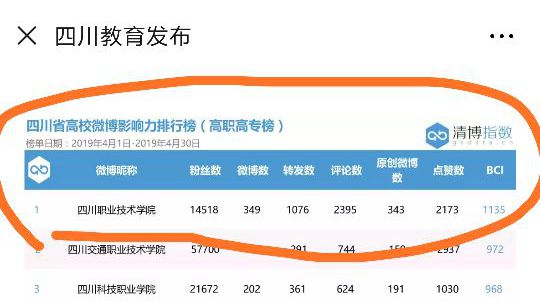 近日,在由四川省教厅发布的高职高专微博排行榜中,我院3月、4月均获得全省第一的好成绩。我院官方微博“四川职业技术学院”由宣传统战部运营,从2017年1月建立至今,一直保持着优异的成绩,能获此殊荣,表明我院网络思想政治工作迈上新台阶。