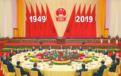 在喜庆欢快的乐曲声中,中外宾朋举杯共贺中华人民共和国成立70周年,祝福中国繁荣富强,祝愿中国同世界各国友谊长青,共创幸福美好未来。