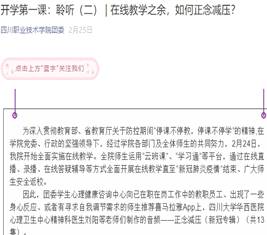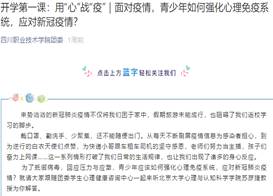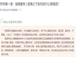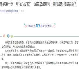 自2020年2月22日起,通过“四川职业技术学院团委”官方微信平台,向全院师生推送抗新冠心理防护系列科普文章、各类人群的心理自助与疏导指南、安心读本以及情绪调节、正念减压音频等,帮助我院师生顺利度过“新冠肺炎疫情”期。截至3月31日,已推送各类心理防护文章共计26篇。