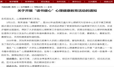 利用“3.25善爱我”——大学生心理健康教育日,开展“读书健心”心理健康教育活动。通过指导学生在疫情期间宅家阅读正能量书籍,引导大学生对生命意义、人生价值进行思考。