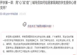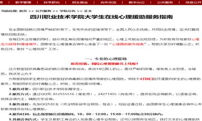 2020年2月3日,为帮助我院学生更好应对新型冠状病毒肺炎疫情所导致的心理困扰,在校园网发布“四川职业技术学院大学生在线心理援助服务指南”。自2月4日起,开通面向学生的心理援助服务。通过QQ号: 812555516(谢老师),24271455(肖老师),向我院在籍学生提供在线心理咨询服务,以语音咨询、视频咨询为主,辅助文字咨询。帮助同学们及时调整心态,积极、乐观地面对疫情。