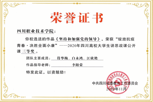 为深入贯彻落实习近平总书记关于教育的重要论述特别是在学校思想政治理论课教师座谈会上的重要讲话精神,坚持不懈用习近平新时代中国特色社会主义思想铸魂育人,深入实施“新时代学校思想政治理论课改革创新先行试点”专项工作。四川省委教育工委日前组织了“绽放抗疫青春·决胜全面小康”——2020年四川高校大学生讲思政课公开课展示作品征集和评选活动。我院由青年马克思主义协会选送的公开课作品——《坚持和加强党的领导》,在四川省第四届高校大学生讲思政课公开课活动中荣获三等奖。