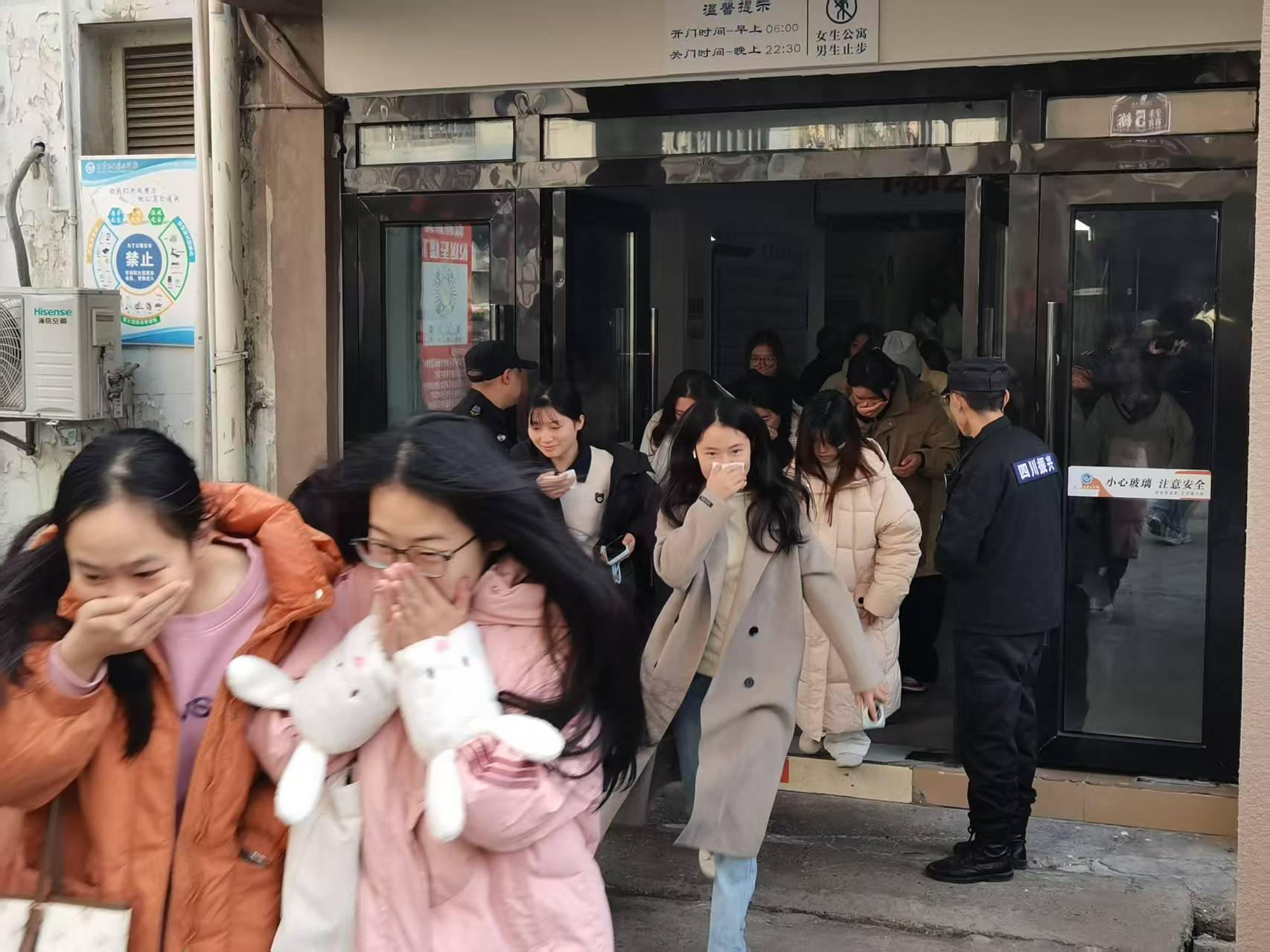 随着应急疏散警报声响起,各楼层学生在老师的引导下,用湿毛巾捂住口鼻,弯腰低姿,迅速按照预定的疏散路线,有序地向集结区域疏散。整个过程迅速、紧张而不慌乱,展现了师生们良好的应急反应能力。